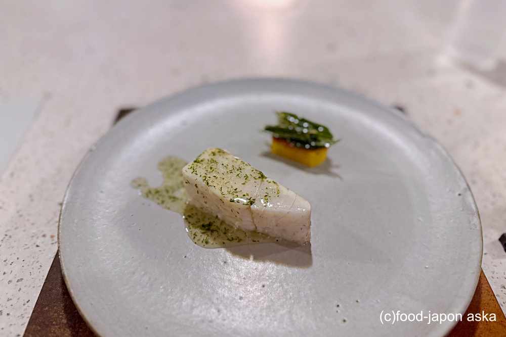 のど黒、えごま葉、青大豆のソース、アーモンド、らっきょう、茗荷、赤ワインビネガー