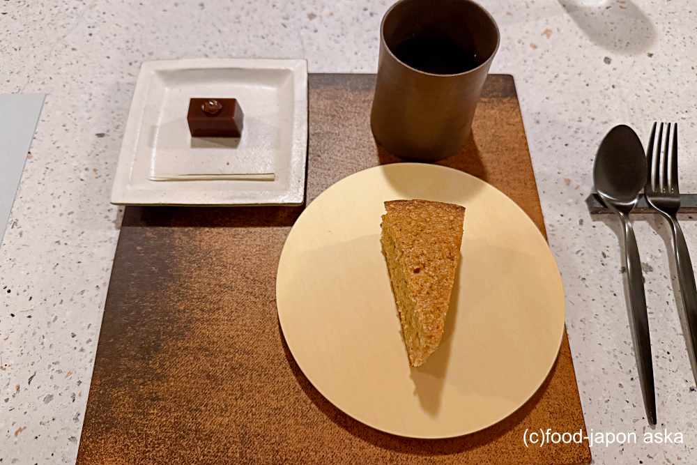ハーブティー、炭オーブンで焼き上げたヘーゼルナッツのケーキ、福井と言えばの水ようかん