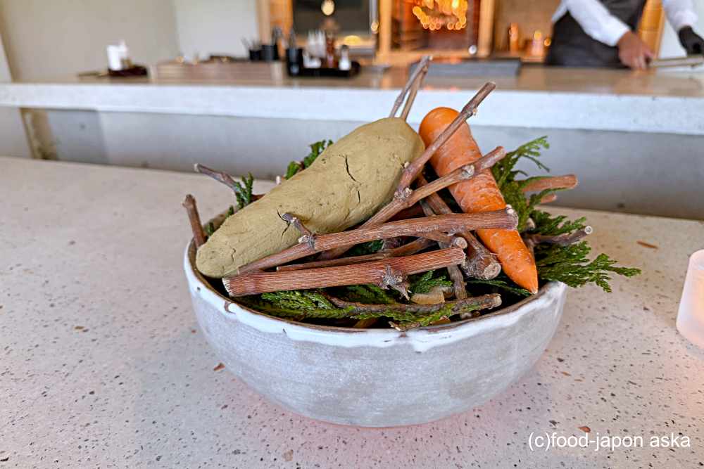 越前焼きの土に包んで、炭のオーブンで1時間焼き上げた人参。包み焼きにすることによって水分も旨みも内包されており美味。