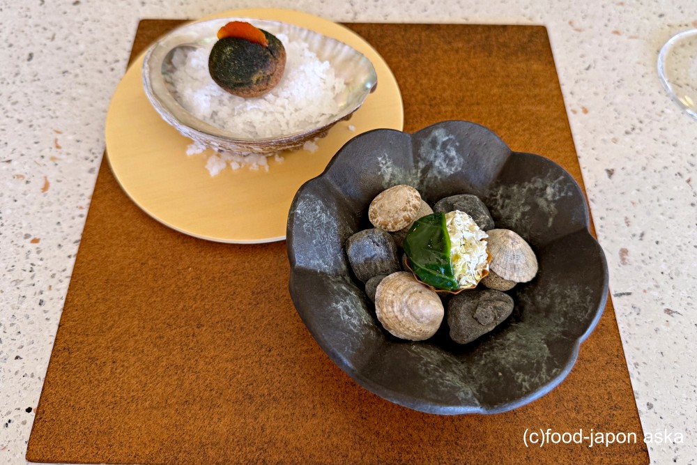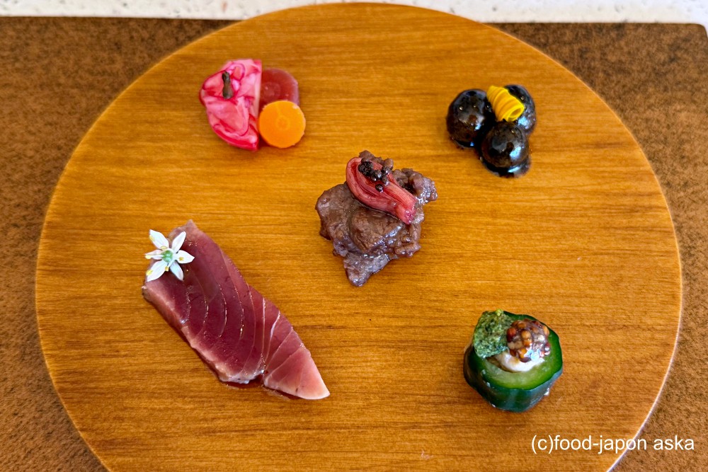 冒頭の「昆布」と「塩雲丹」の二皿は、同じコンセプトで各異なるアプローチで味わわせてくれて最初から驚き。「越前-里山-」では、椎茸のスライスをクロスティーニに美しく並べた料理。椎茸のつるんとした切れ味、食感が鮑のようでした。鹿肉タルタールに椎茸ジュの旨みが重なり、品の中に山の生命力を感じました。