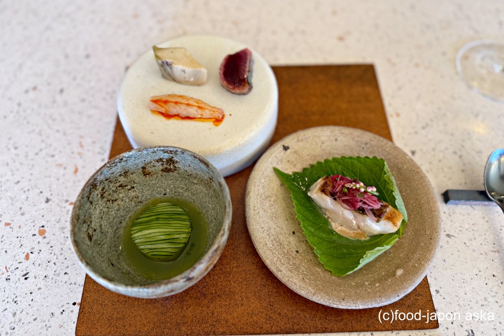 ヒラソウダガツオ、焼き茄子エキスソース、ガマエビ(越前海老)、赤パプリカジュース