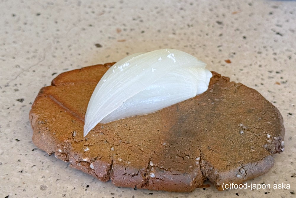 玉葱を越前焼きと同じ土で包み、1時間炭のオープンで焼き上げて。みずみずしく甘い。