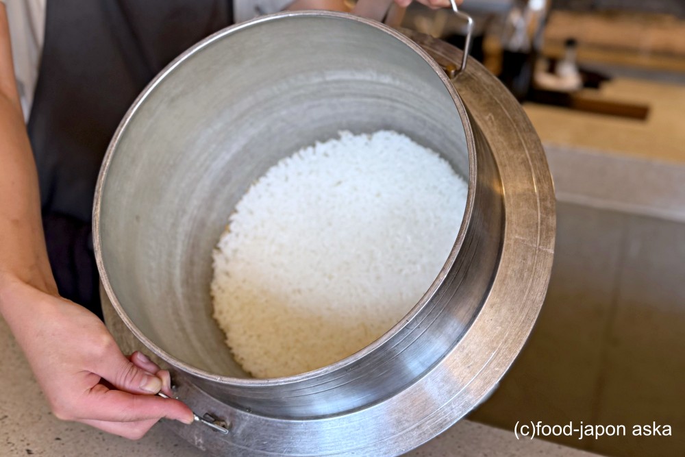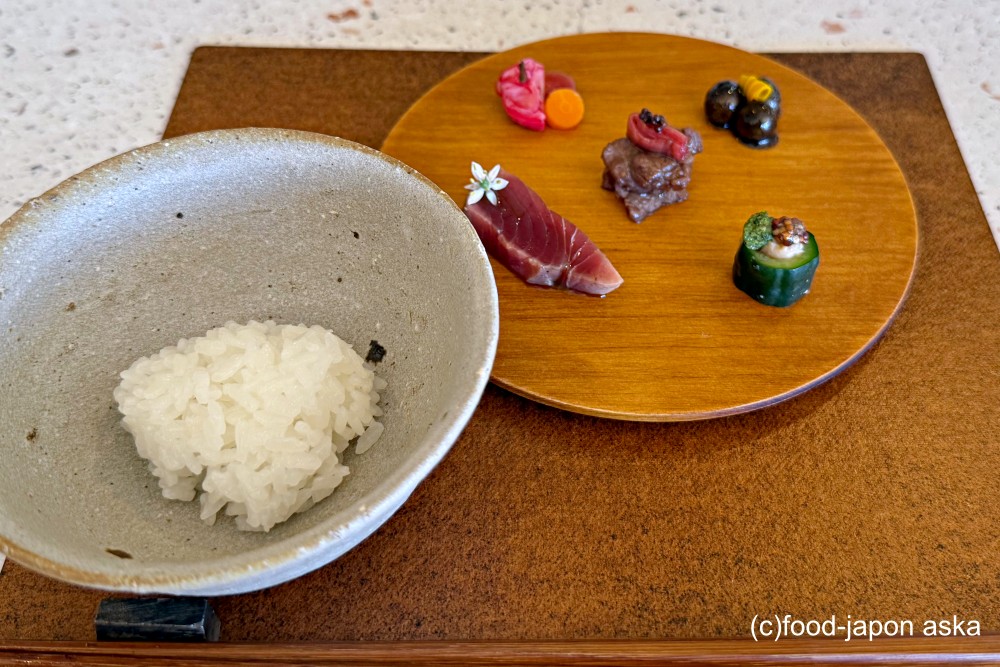 そしてクライマックスとも言えるのが、薪台で炊き上げられる「しらやまのお米」。ご飯そのものの美味しさは言うまでもなく、赤ワインの牛しぐれ、塩ウニなど、ご飯のお供がジオラマのように可愛らしくて心躍りました。最後まで手抜きなしの丁寧さが光ります。ご飯のおかわりは、飛魚スープでお茶漬け仕立てにして、ナスタチウムの花がピリリと山葵のようなニュアンスでした。
