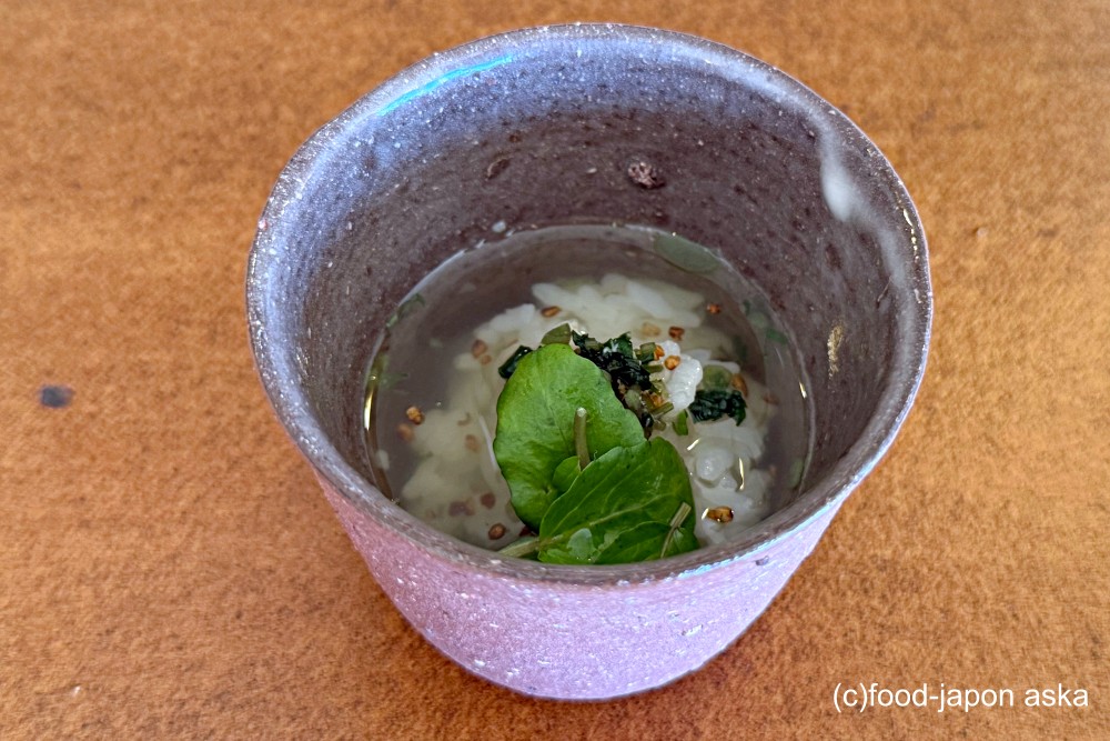そばの実、天然クレソン漬け物、連子鯛のスープがけ(魚と水だけで)