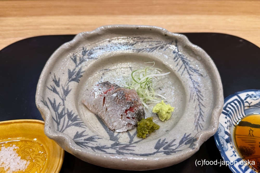 脂の乗った美味しいイワシ。薬味として添えられたのは、行者ニンニクのたたき。風味で春の野趣を感じさせる。