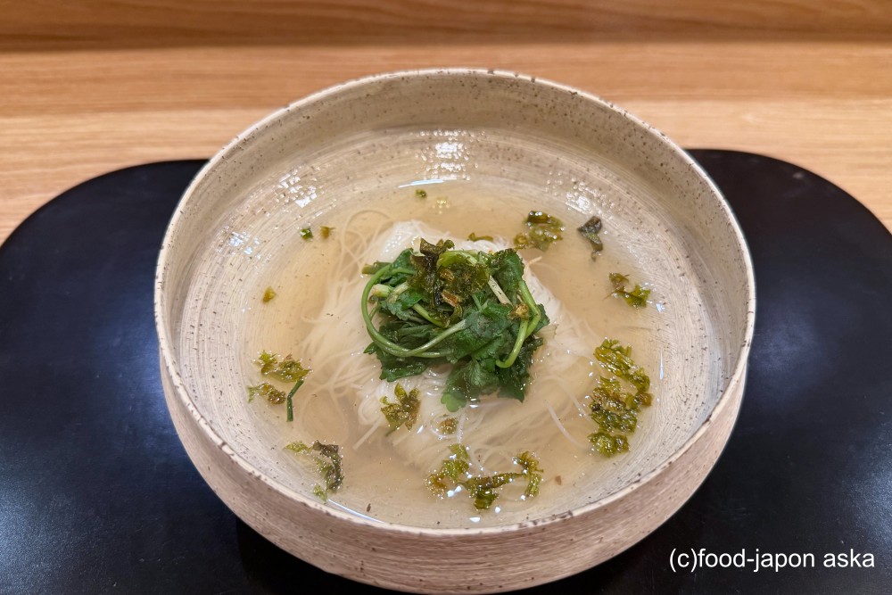 芹、ミツバ、蕗のとうの滋味が折り重なる春の煮麺。貝の旨みをすっと効かせた出汁がやさしく広がり、胃の奥からじんわりと温めてくれる、ホッとするやさしい味わい。