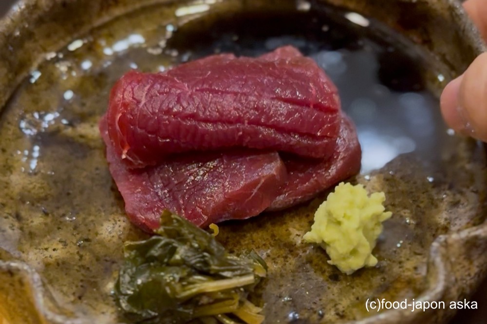 ほどよい厚みで引かれたクジラは、しなやかで歯が喜ぶ食感。添え物のセンナの醤油漬けも美味。